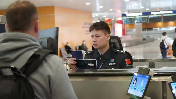 A customs officer checks the passport of an inbound tourist. [Photo/WeChat ID: pdnews]