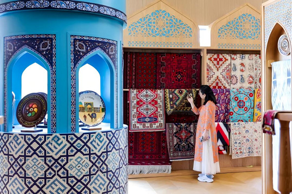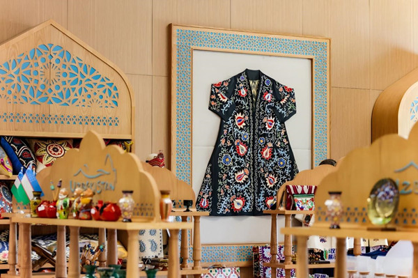 Distinguished handicrafts and clothes are showcased at the Uzbekistan Pavilion. [Photo/WeChat ID: pdnews]